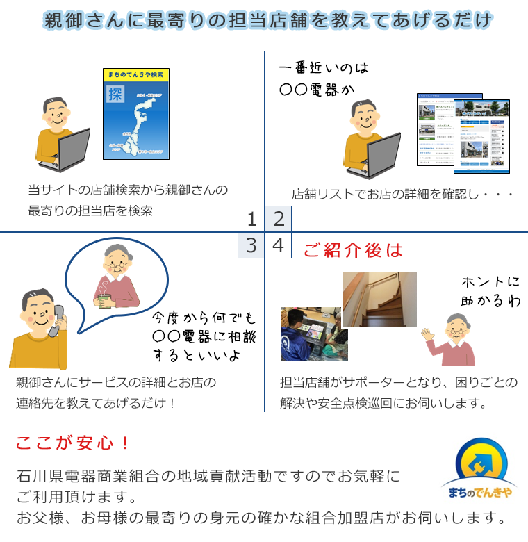 石川県電器商業組合の組合員である「まちのでんきや」が地域高齢者の暮らしのサポーターとなり、離れて暮らす息子さん、娘さんの親孝行をお手伝いします!
