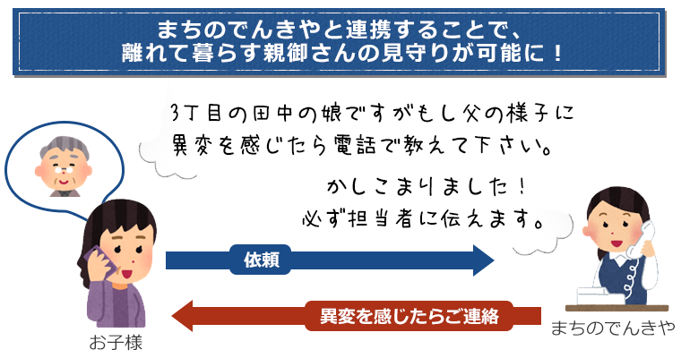 でも、親御さんのサポートを担当する「まちのでんきや」ならばご用の度に親御さんと直接顔を合わせ会話をするので親御さんの異変に気づきやすく、見守りのパートナーとして適役です。